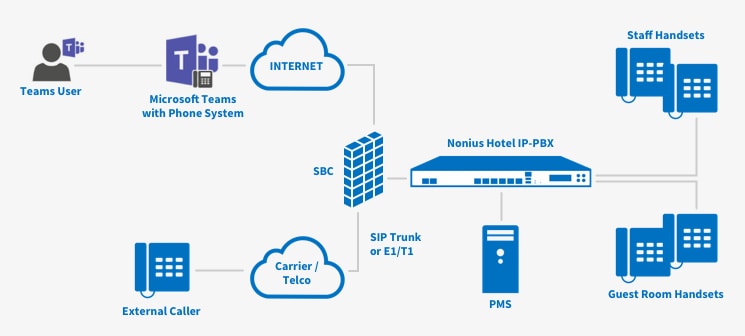 Leveraging the MS Teams Phone System and the Nonius hotel IP-PBX system you can have your employees working from anywhere and still stay connected with the office phone number. It can be done without the complexity of legacy solutions (like using VPNs) and keeping all communication secure.