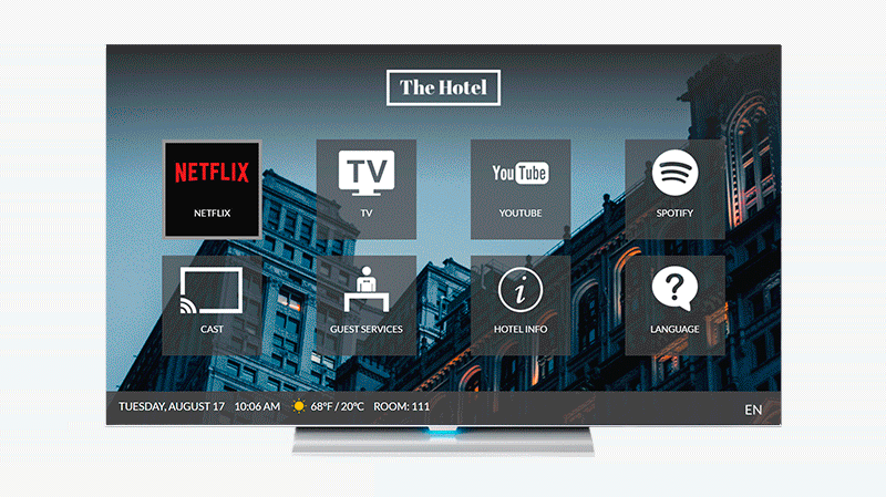 It’s easier than ever for guests to access their Netflix account on the hotel’s TV. Access is available directly from the Interactive TV menu, and the guest can choose to insert their credentials on the TV or on their own mobile device, so they will be able to stream content to the TV.