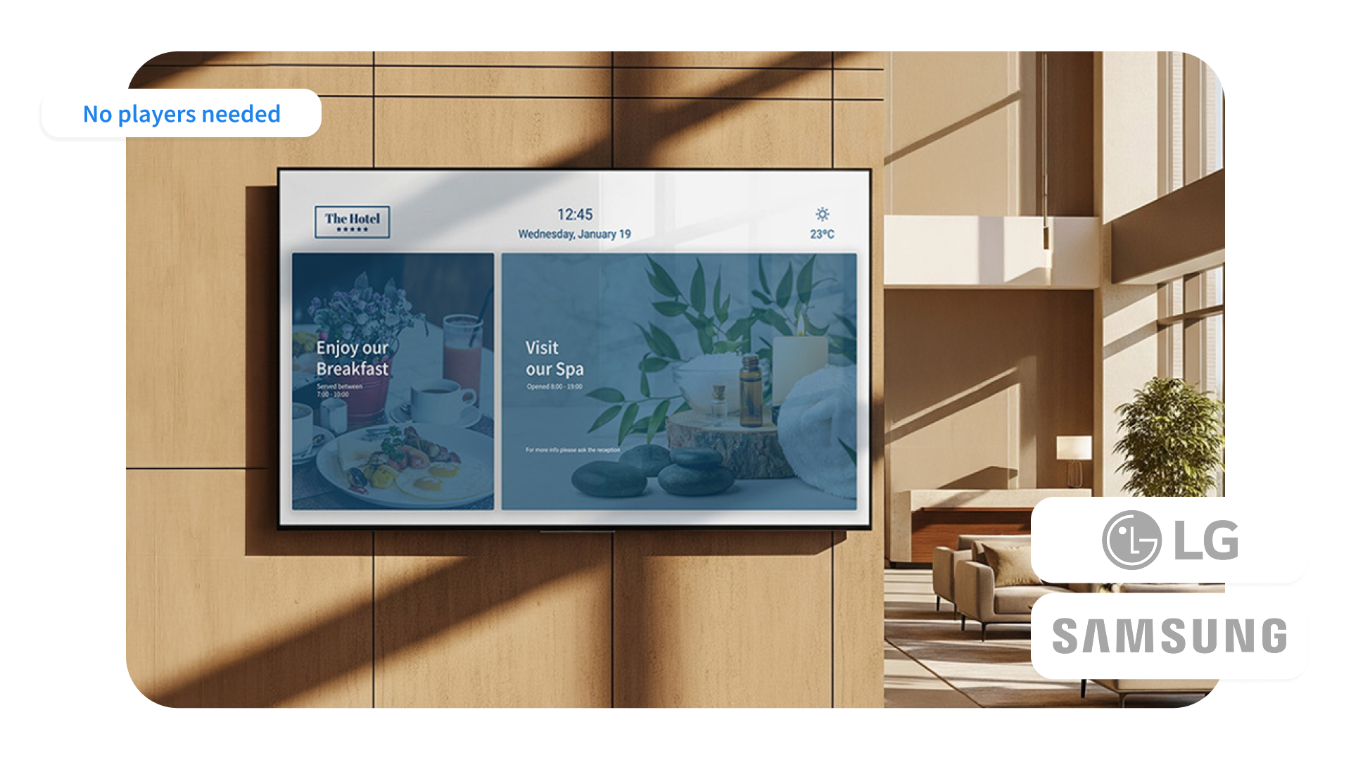- Nonius Signage fonctionne désormais en mode natif sur les écrans Samsung Tizen et LG webOS, ce qui permet de supprimer les lecteurs multimédias externes et de simplifier la configuration. Les hôtels gèrent tous les écrans depuis le cloud, tandis que les clients bénéficient d’informations claires, dynamiques et attrayantes dans tout l’établissement.
