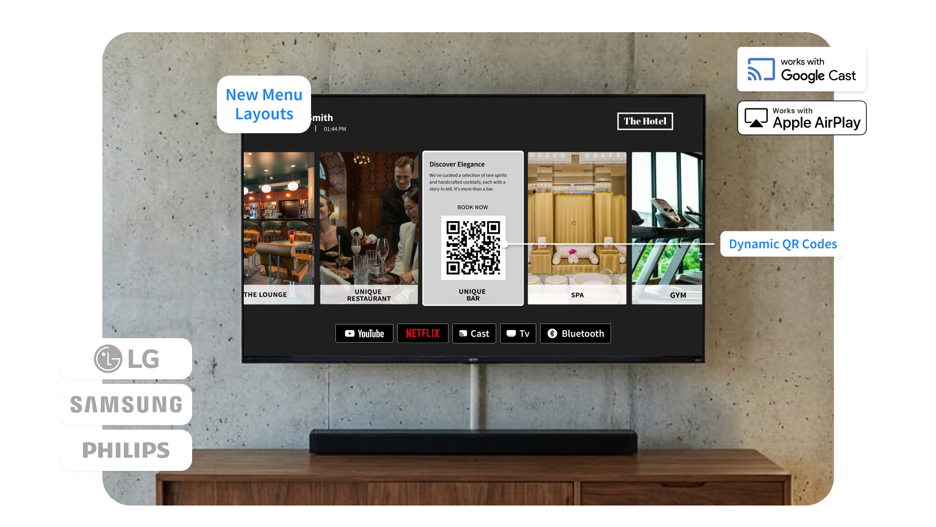 - Cette année, nous avons obtenu la certification Google Cast pour les téléviseurs hôteliers LG, Samsung et Philips, supprimant ainsi les dongles externes et les ajustements locaux. Les hôtels bénéficient d’un streaming sécurisé et entièrement géré, et les clients peuvent diffuser instantanément depuis n’importe quel appareil, comme à la maison.