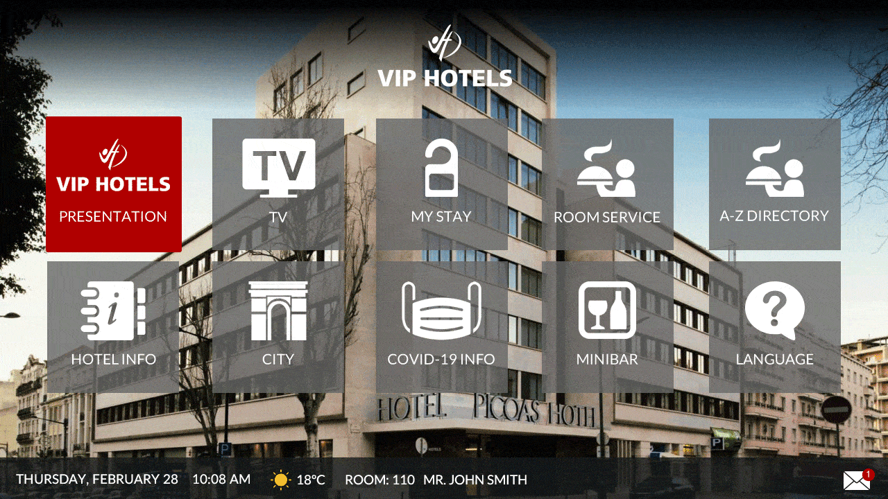 Os quartos do VIP Executive Picoas Hotel estão equipados com a nossa solução de TV Interativa através de Smart Hospitality TVs da Samsung. A nossa solução permite que o hotel exiba, em todos os quartos, promoções, serviços e uma grande quantidade de informações úteis, tais como o seu protocolo de segurança e room service.